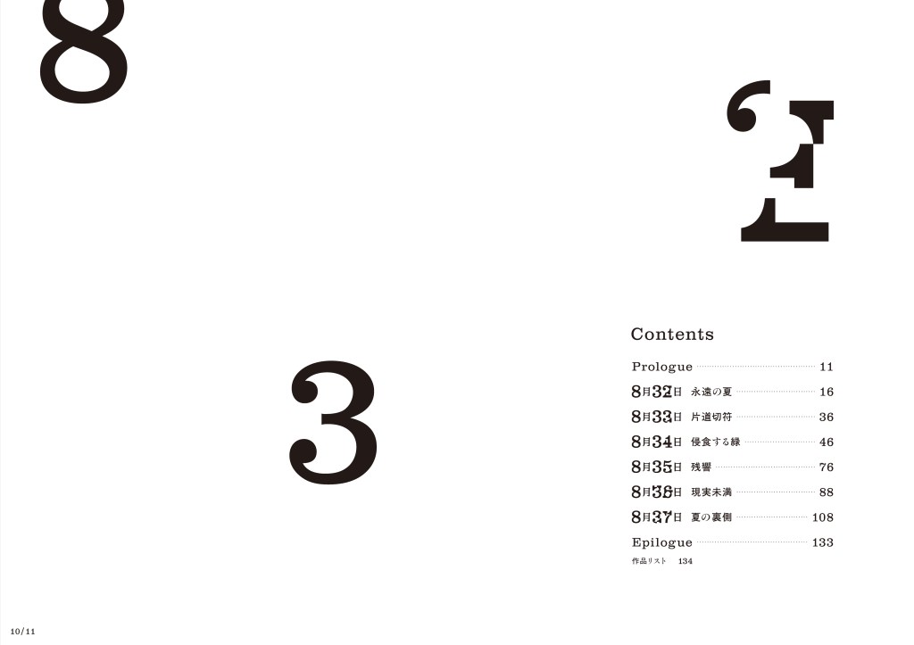 各章は8月32日、8月33日、8月34日…と日付が進んでいき、それぞれに「放課後」「既視感」「視線」「歪み」などのテーマを設けています。読み進めるにつれて風景が次第におかしくなり、どこか不穏で恐ろしい雰囲気を醸し出す写真作品集です。